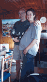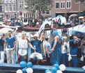 And now the great international fun city you've all heard about: Amsterdam (a.k.a., A'dam). We actually stayed on a houseboat there, with Han and Maartje (she being the sister of Anneke's sister's husband). She was just about to have a baby when we saw them. It really was a boat, built to carry freight in 1905...but now it's all set up for living, kitchen, TV, computer -- the works. They're building a new one though, for the baby. Our other Amsterdam friends, Jan and Uwe, took us to the gay pride parade...floating down the canal of course. That's the Israeli float (look carefully). The police were handing out these little cards, promising to protect us if anybody was trying to intimidate us on grounds of our sexuality.