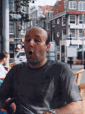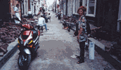 Here's Uwe, the next morning, enjoying breakfast at the Rembrandt square. Jan took great pictures of everything...but I didn't get a good picture of him. Ain't that the way it always goes? Later, Anneke showed me a little bit of her past, taking me down the streets where she once lived in Amsterdam, not far from the Anne Frank house. Here is one of those lovely brick streets, all torn up for reconstruction. A close-up reveals a Reiki practitioner giving a hands-on treatment under the Amsterdam flag.