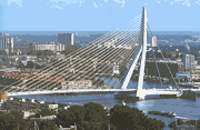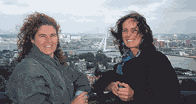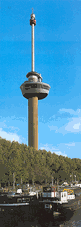 But first -- let's go visit one of my friends...in Rotterdam! I knew Cora from San Diego, friend of my girlfriend in those days, and I rented a room at her place. Well, Cora is very happy to be back in a sane country like Holland, and she took a little time to show us around. At my request, we went up the Euromast -- a great big tower from which you can see all Rotterdam and beyond. There I am with her up there, wind blowing wildly in our hair, and there's Anneke with Cora (they had a lot to talk about, you know, divorce, female hormones and stuff), and note -- in the background, the Swan, yes, see that strangely sculptural suspension bridge? Take another look and notice how it litterally dwarfs the skyscrapers around it. The thing is HUGE! Do you hear me? Colossal! We went down to a little old section and had tacos, right outside the original church that the famous Pilgrim Fathers left, to come ultimately to America where they nearly starved to death, all for their pigheaded puritanical intolerant religious doctrine. But I'm not bitter or anything. Now let's review the main points of Holland...
